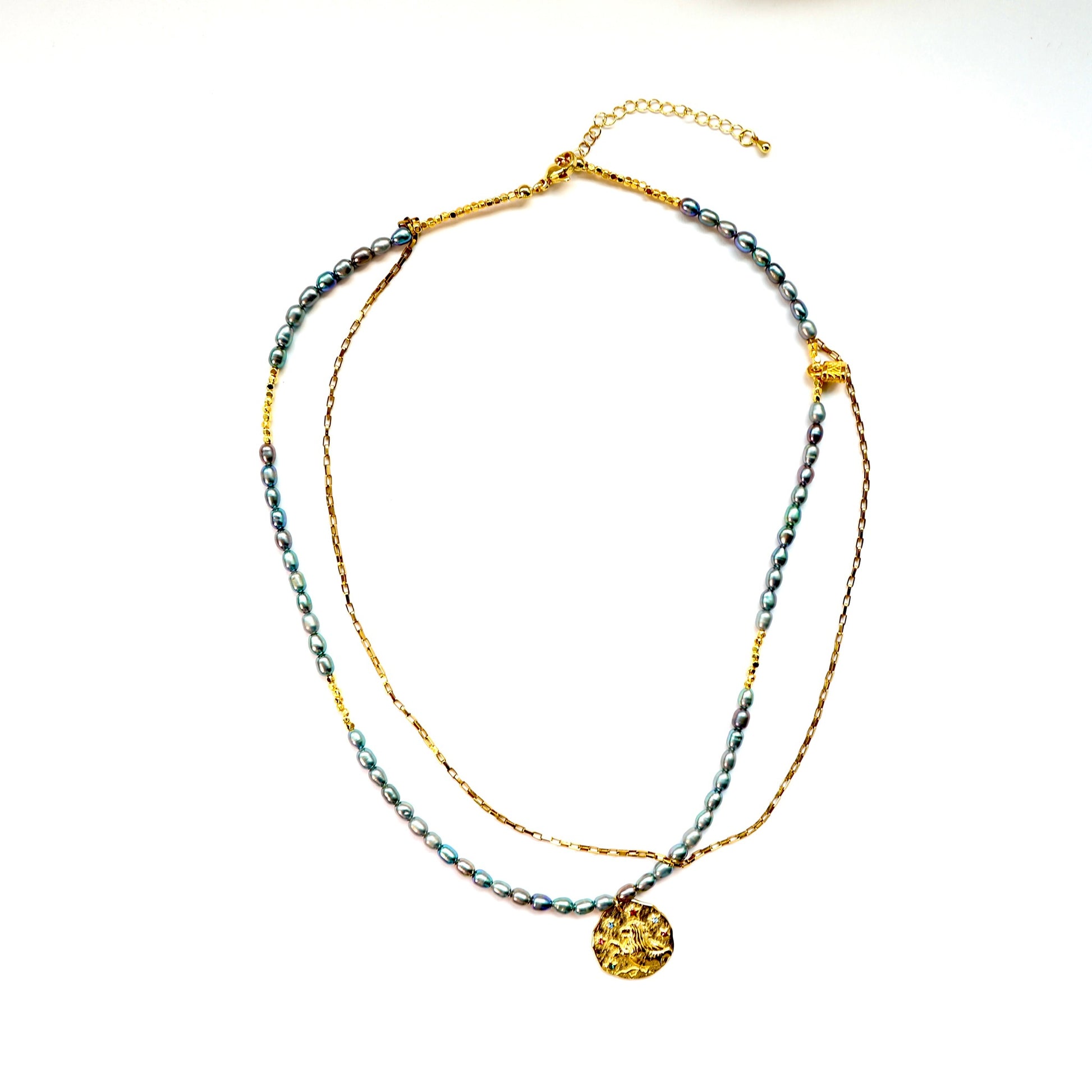 Kompozycję przełamuje delikatny pozłacany łańcuszek oraz złoty medalion o organicznej fakturze, który dodaje całości artystycznego, wyjątkowego charakteru.