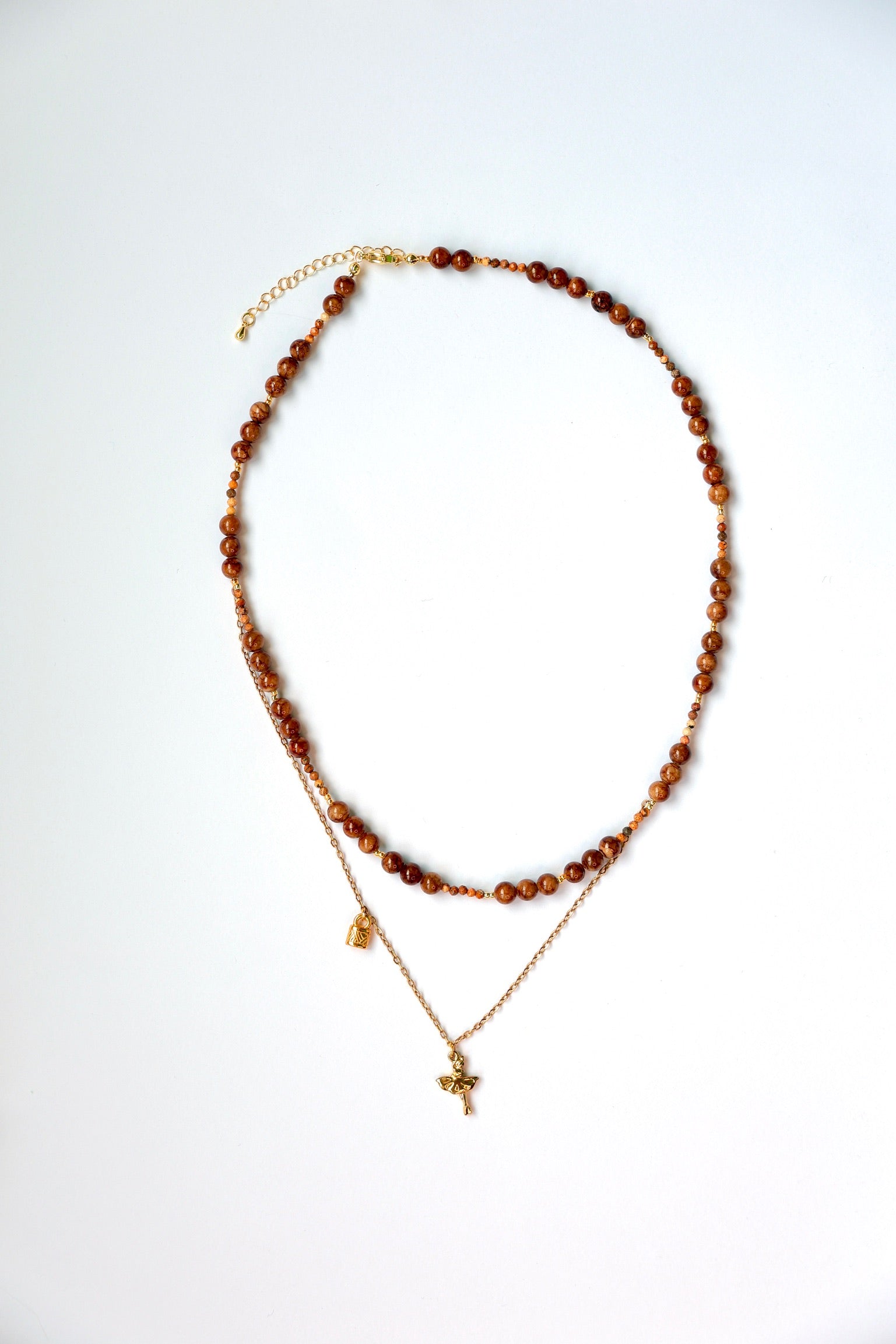 En unik dobbelt halskæde, der kombinerer naturlige brune sten med en fin, forgyldt kæde.
