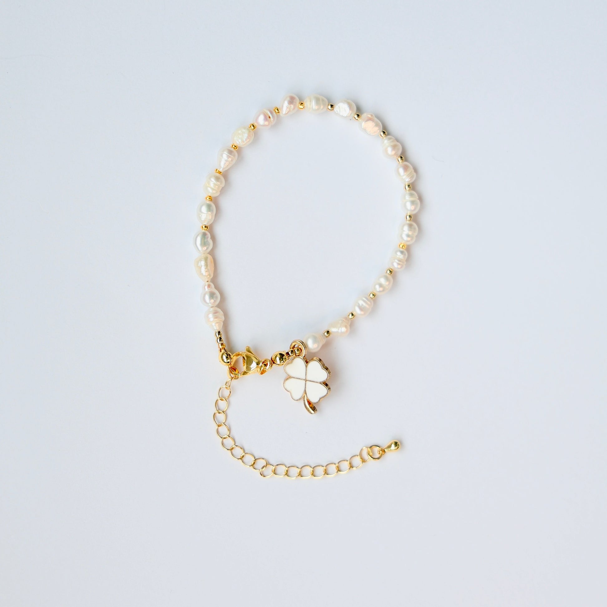 Et delikat armbånd med naturlige perler og forgyldt sølv, pyntet med et sødt firkløvervedhæng 🍀