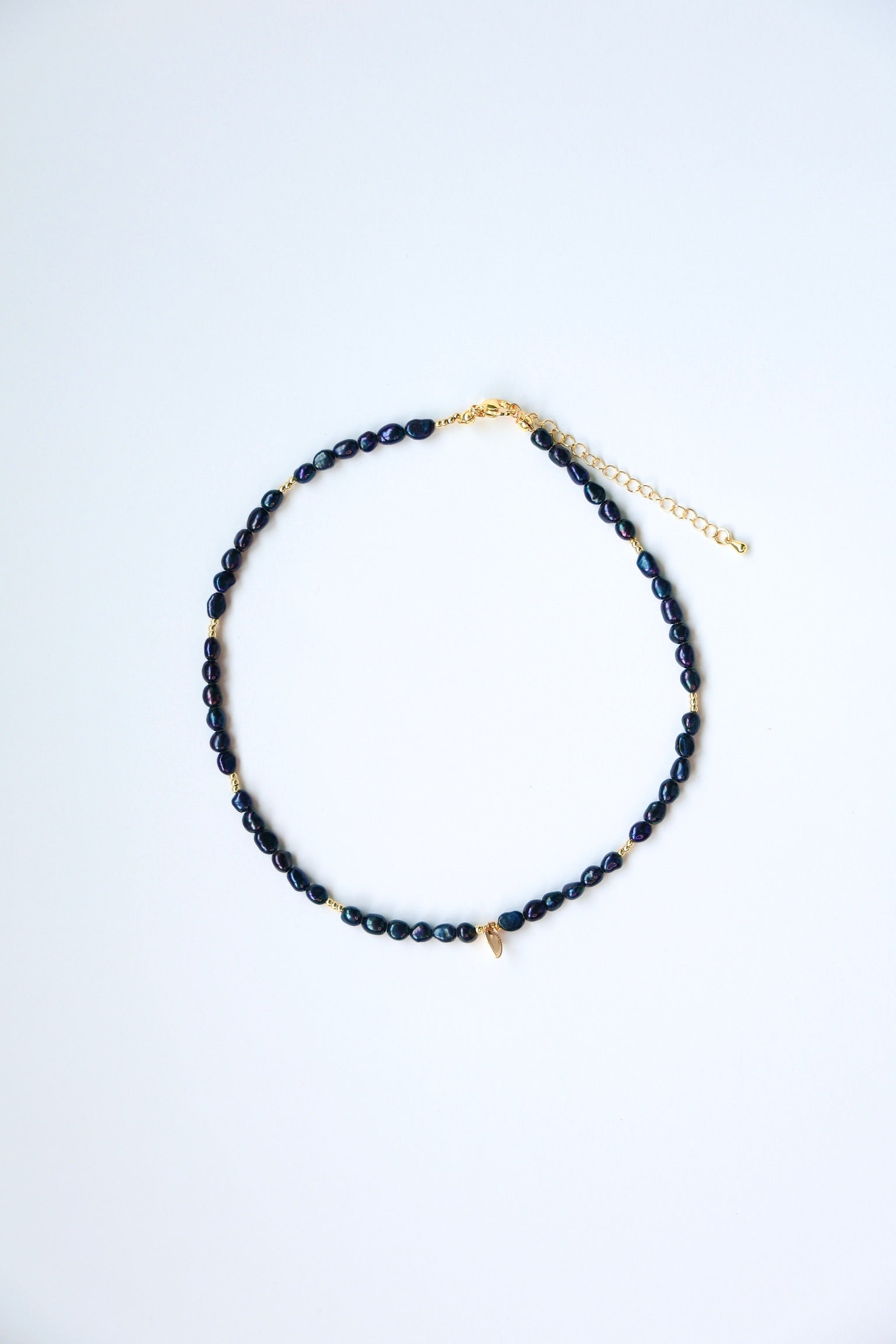 En elegant og sanselig halskæde lavet af naturlige mørke perler i en dyb blå-sort tone med metallisk glans.