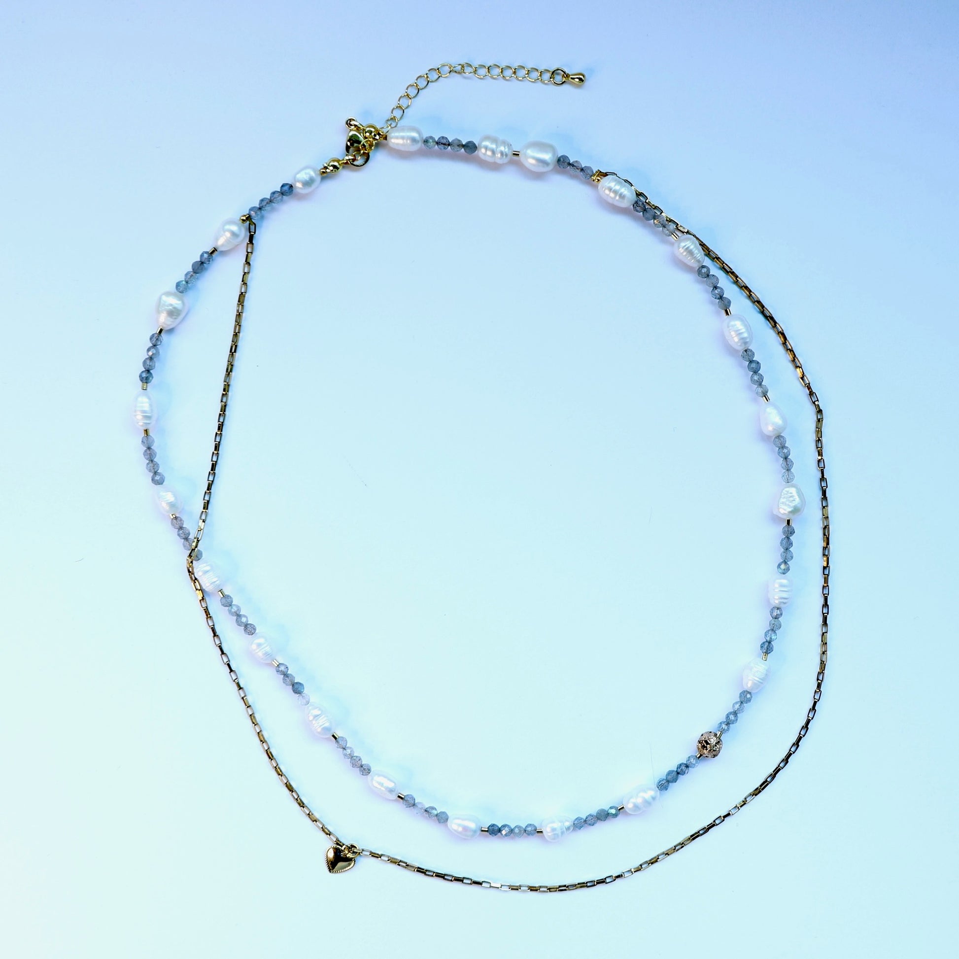 En romantisk, dobbeltlaget halskæde med naturlige perler og fine lyseblå krystaller.