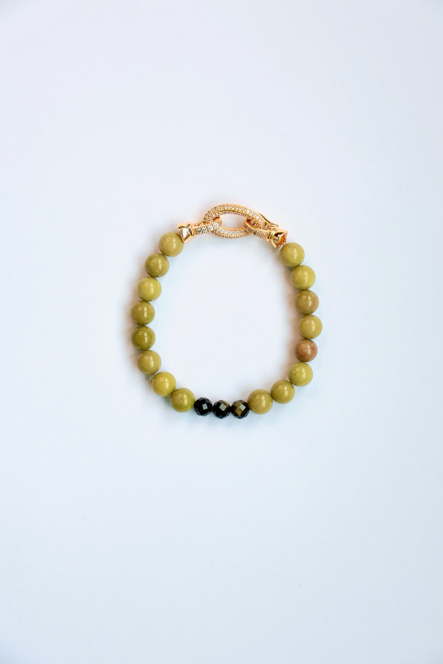 Bransoletka wykonana z naturalnego jadeitu w odcieniach oliwki, uzupełniona czarnymi, fasetowanymi kamieniami i eleganckim zapięciem ze srebra pozłacanego 14k złotem.