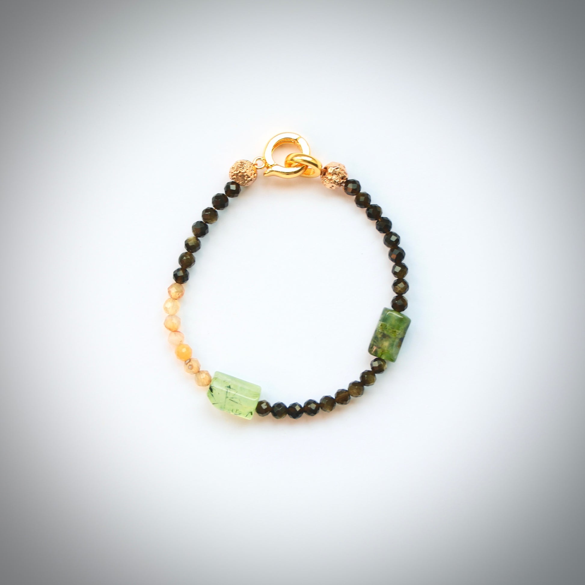 Et armbånd af naturlige sten i jordfarver – en kombination af grøn turmalin, citrin og brun agat, afsluttet med forgyldt sølv (14k guld) ✨