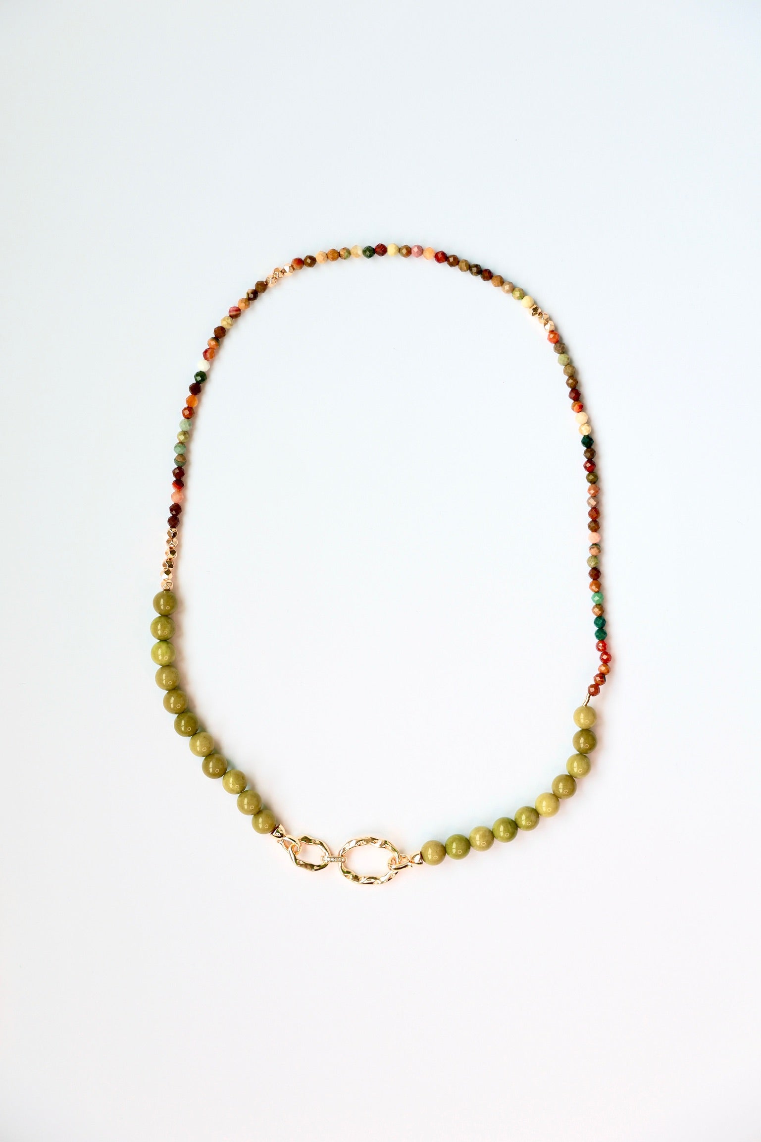 En elegant og naturlig halskæde skabt af små multifarvede sten i varme jordtoner og olivengrønne nuancer.